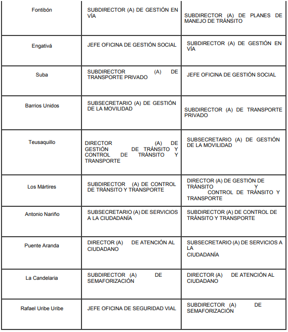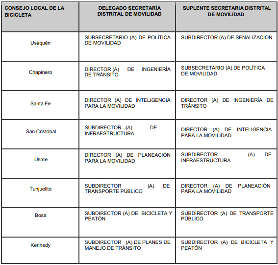 ARTÍCULO PRIMERO. Delegar la participación del Secretario Distrital de Movilidad para la conformación de los Consejos Locales de la Bicicleta, en cada una de las localidades, en los siguientes servidores públicos según corresponda: