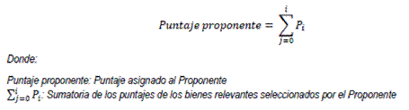 Definido el puntaje de cada bien nacional relevante, la Entidad Estatal otorgará el puntaje a cada Proponente dependiendo de la cantidad de bienes nacionales relevantes ofertados y el puntaje individual asignado a cada uno de ellos. Para la asignación de este puntaje se aplicará la siguiente fórmula. Para efectos de la asignación del puntaje a los Proponentes, la Entidad Estatal tendrá en cuenta hasta el séptimo decimal. En todo caso, el puntaje asignado a los Proponentes no podrá superar los veinte (20) puntos.