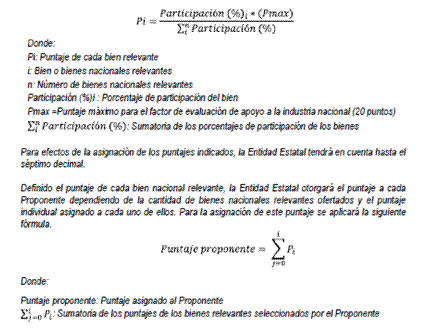 Para efectos de la asignación de puntaje, la Entidad Estatal definirá el puntaje de cada bien nacional relevante de acuerdo con su porcentaje de participación, para lo cual aplicará la siguiente fórmula.